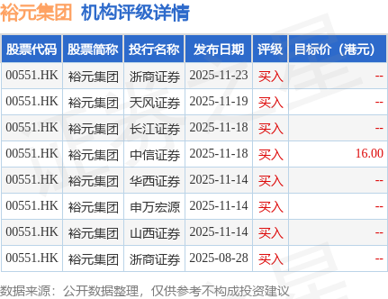截至2025年11月24日收盘,裕元集团(00551.HK)报收于16.28港元,上涨3.17%,成交量504.9万股,成交额8144.95万港元。投行对该股的评级以买入为主,近90天内共有8家投行给出买入评级,近90天的目标均价为16港元。浙商证券最新一份研报给予裕元集团买入评级。