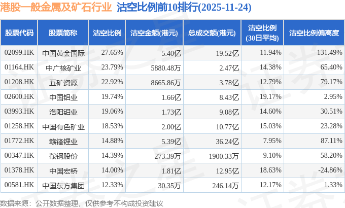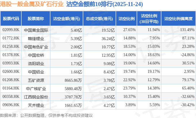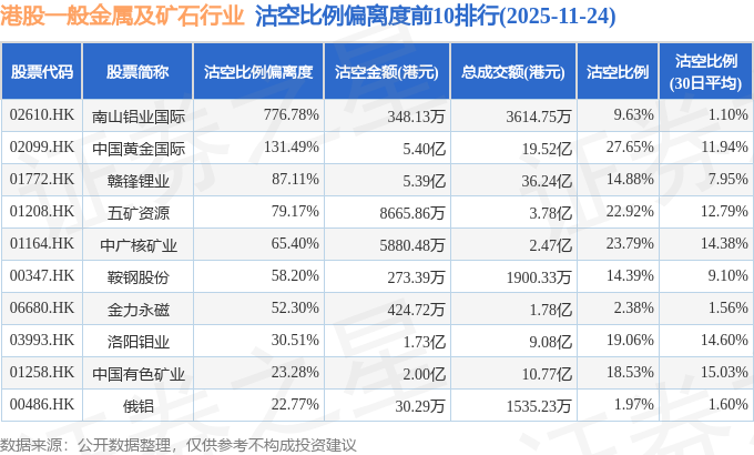 从沽空比例偏离度来看,南山铝业国际、中国黄金国际、赣锋锂业沽空比例偏离度位居行业前三,分别为776.78%、131.49%、87.11%。