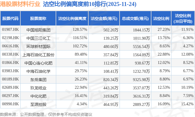 从沽空比例偏离度来看,中国旭阳集团、中国三江化工、环球新材国际沽空比例偏离度位居行业前三,分别为128.57%、116.51%、102.72%。