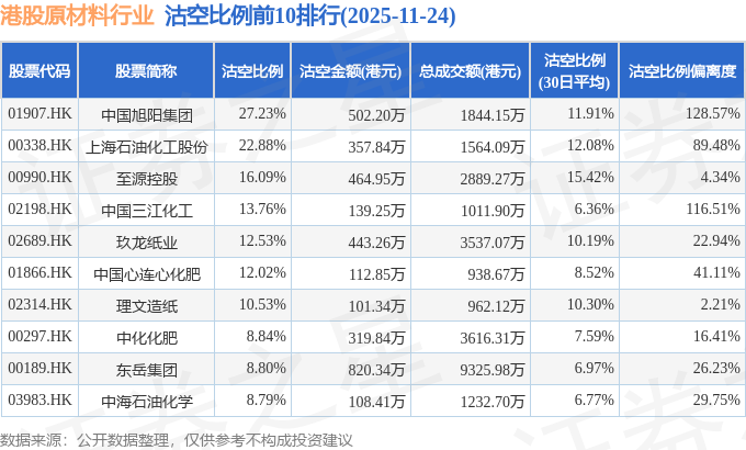 从沽空比例来看,中国旭阳集团、上海石油化工股份、至源控股沽空比例位居行业前三,分别为27.23%、22.88%、16.09%。