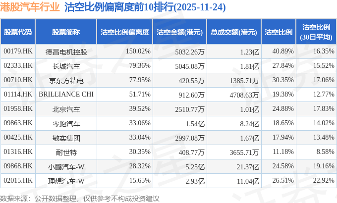 从沽空比例偏离度来看,德昌电机控股、长城汽车、京东方精电沽空比例偏离度位居行业前三,分别为150.02%、79.36%、77.95%。
