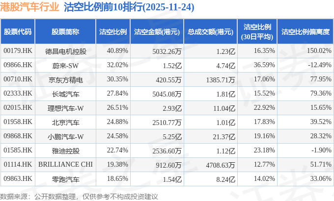 从沽空比例来看,德昌电机控股、蔚来-SW、京东方精电沽空比例位居行业前三,分别为40.89%、32.02%、30.35%。