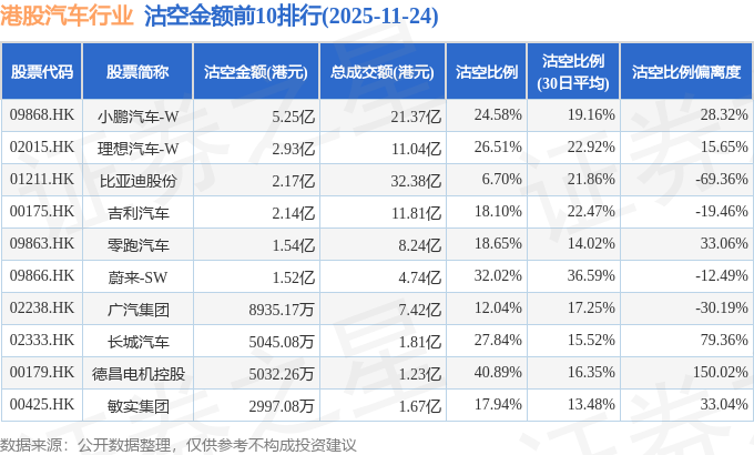 从沽空金额来看,小鹏汽车-W、理想汽车-W、比亚迪股份沽空金额位居行业前三,分别为5.25亿港元、2.93亿港元、2.17亿港元。
