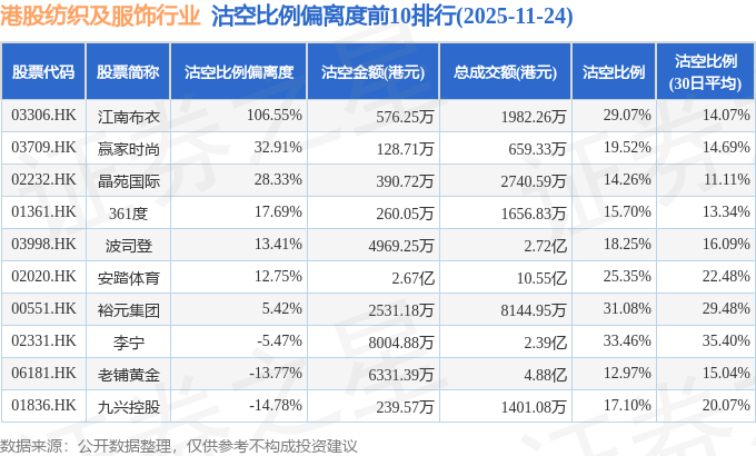 证券之星消息,11月24日港交所披露数据显示,当日港股纺织及服饰行业的119只个股中有18只被沽空,总沽空股数为2360.73万股,总沽空金额为6.16亿元(港元),而当日纺织及服饰行业的总成交金额为29.36亿元(港元),沽空比例为20.97%。当日纺织及服饰行业总体涨1.08%。
