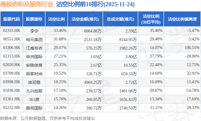 从沽空比例来看,李宁、裕元集团、江南布衣沽空比例位居行业前三,分别为33.46%、31.08%、29.07%。