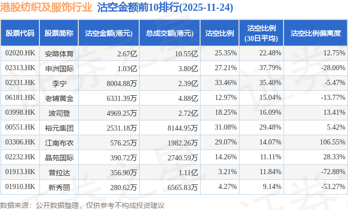 从沽空金额来看,安踏体育、申洲国际、李宁沽空金额位居行业前三,分别为2.67亿港元、1.03亿港元、8004.88万港元。