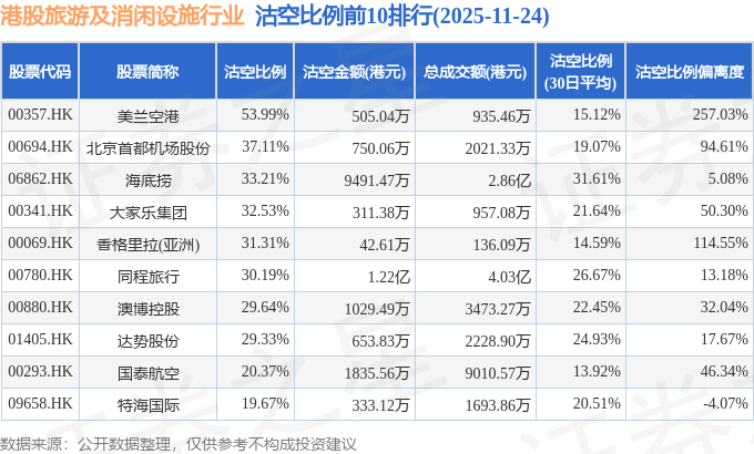 从沽空比例来看,美兰空港、北京首都机场股份、海底捞沽空比例位居行业前三,分别为53.99%、37.11%、33.21%。