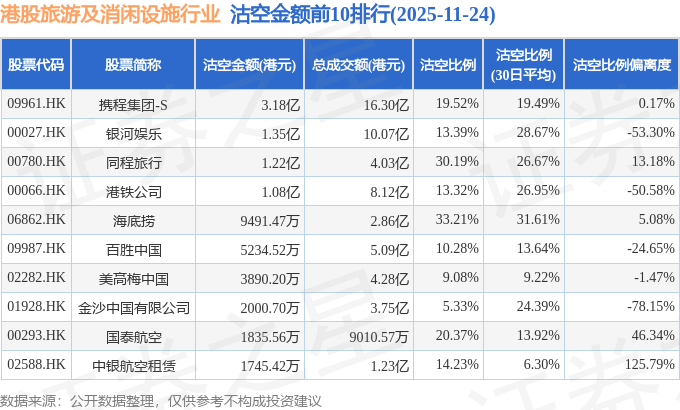 从沽空金额来看,携程集团-S、银河娱乐、同程旅行沽空金额位居行业前三,分别为3.18亿港元、1.35亿港元、1.22亿港元。