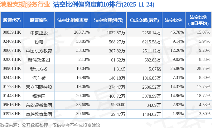 从沽空金额来看,新东方-S、中教控股、粉笔沽空金额位居行业前三,分别为1.31亿港元、1032.87万港元、568.27万港元。