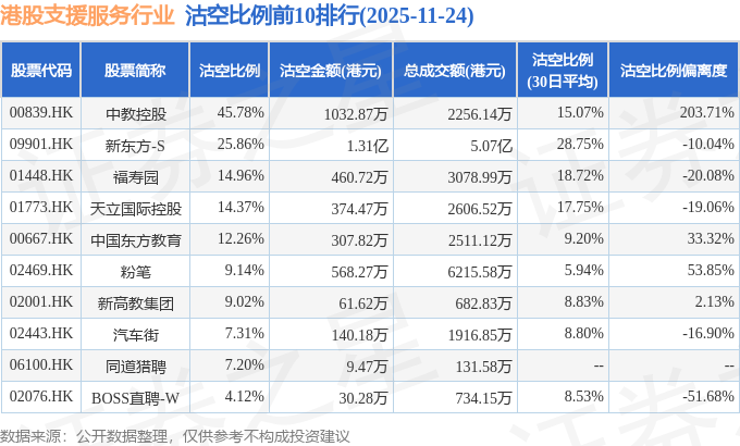 从沽空比例来看,中教控股、新东方-S、福寿园沽空比例位居行业前三,分别为45.78%、25.86%、14.96%。