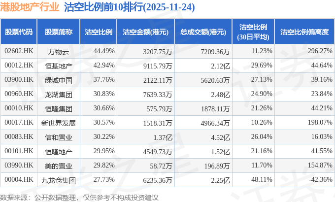 从沽空比例来看,万物云、恒基地产、绿城中国沽空比例位居行业前三,分别为44.49%、42.94%、37.76%。