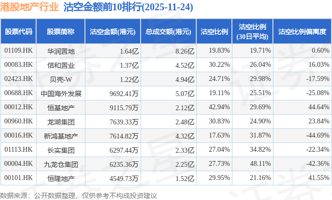 从沽空金额来看,华润置地、信和置业、贝壳-W沽空金额位居行业前三,分别为1.64亿港元、1.37亿港元、1.22亿港元。