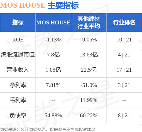 MOS HOUSE港股市值7.8亿港元,在其他建材行业中排名第4。主要指标见下表: