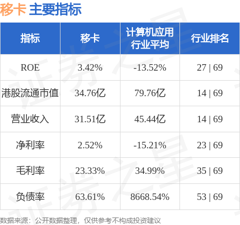 移卡港股市值34.76亿港元,在计算机应用行业中排名第14。主要指标见下表: