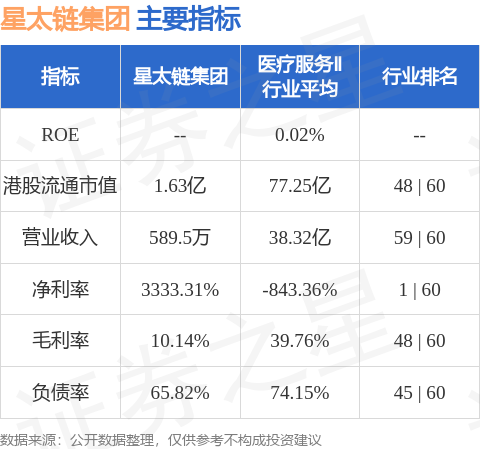 星太链集团港股市值1.63亿港元,在医疗服务Ⅱ行业中排名第48。主要指标见下表: