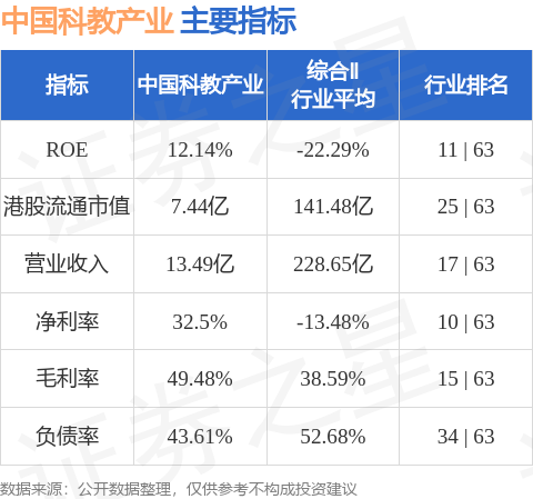 中国科教产业港股市值7.44亿港元,在综合Ⅱ行业中排名第25。主要指标见下表: