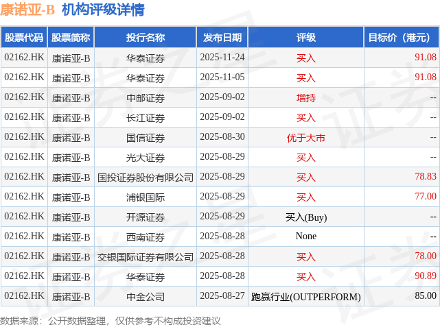 投行对该股的评级以买入为主,近90天内共有8家投行给出买入评级,近90天的目标均价为84.55港元。华泰证券最新一份研报给予康诺亚-B买入评级,目标价91.08港元。