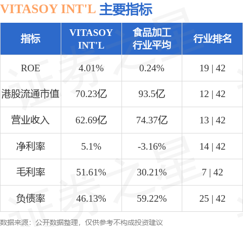 VITASOY INT'L港股市值70.23亿港元,在食品加工行业中排名第12。主要指标见下表: