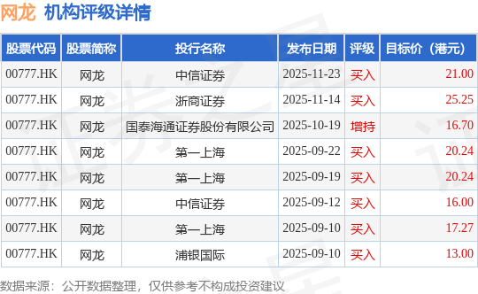 截至2025年11月25日收盘,网龙(00777.HK)报收于11.76港元,上涨3.43%,成交量212.69万股,成交额2473.67万港元。投行对该股的评级以买入为主,近90天内共有7家投行给出买入评级,近90天的目标均价为18.71港元。中信证券最新一份研报给予网龙买入评级,目标价21港元。