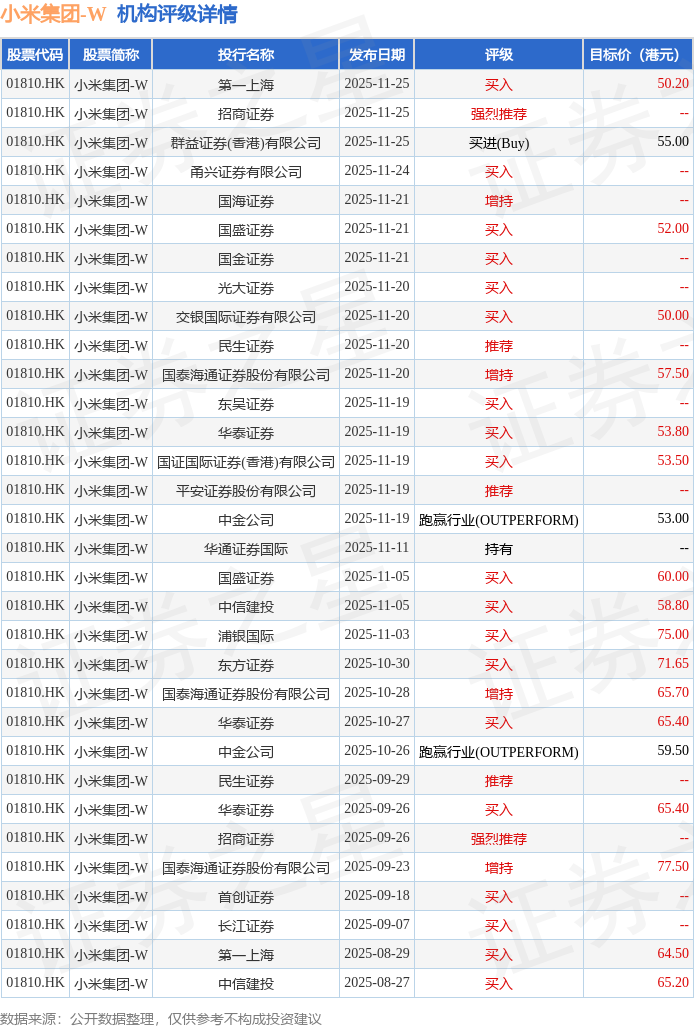 截至2025年11月25日收盘,小米集团-W(01810.HK)报收于40.34港元,上涨4.35%,成交量3.17亿股,成交额127.95亿港元。投行对该股的评级以买入为主,近90天内共有19家投行给出买入评级,近90天的目标均价为60.72港元。第一上海最新一份研报给予小米集团-W买入评级,目标价50.2港元。