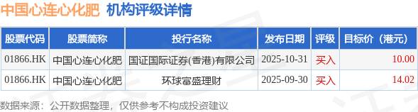 截至2025年11月25日收盘,中国心连心化肥(01866.HK)报收于7.69港元,上涨3.78%,成交量275.8万股,成交额2112.8万港元。投行对该股的评级以买入为主,近90天内共有2家投行给出买入评级,近90天的目标均价为12.01港元。国证国际证券(香港)有限公司最新一份研报给予中国心连心化肥买入评级,目标价10港元。
