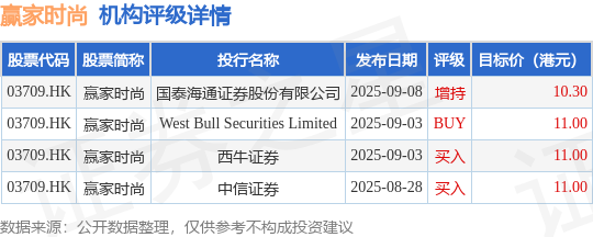 截至2025年11月25日收盘,赢家时尚(03709.HK)报收于8.05港元,下跌0.74%,成交量92.9万股,成交额751.54万港元。投行对该股的评级以买入为主,近90天内共有2家投行给出买入评级,近90天的目标均价为10.82港元。国泰海通证券股份有限公司最新一份研报给予赢家时尚增持评级,目标价10.3港元。