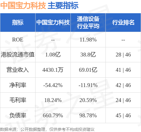 中国宝力科技港股市值1.08亿港元,在通信设备行业中排名第28。主要指标见下表: