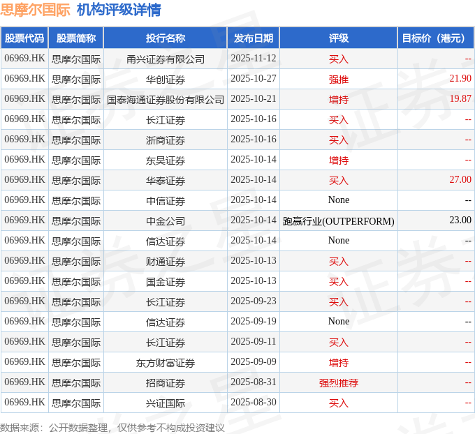 投行对该股的评级以买入为主,近90天内共有9家投行给出买入评级,近90天的目标均价为22.94港元。甬兴证券有限公司最新一份研报给予思摩尔国际买入评级。