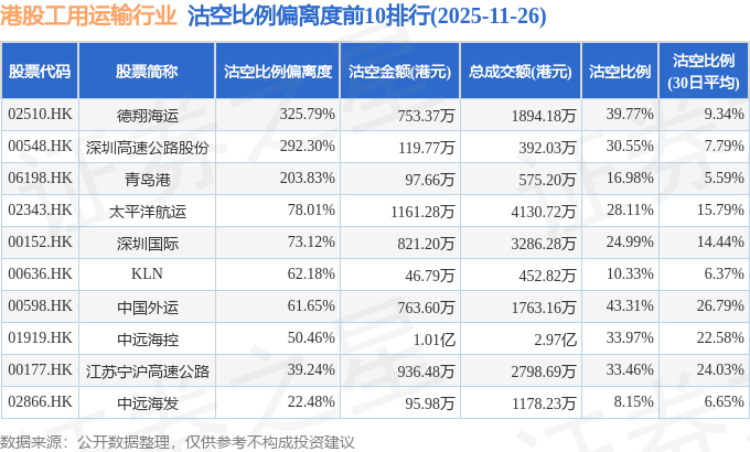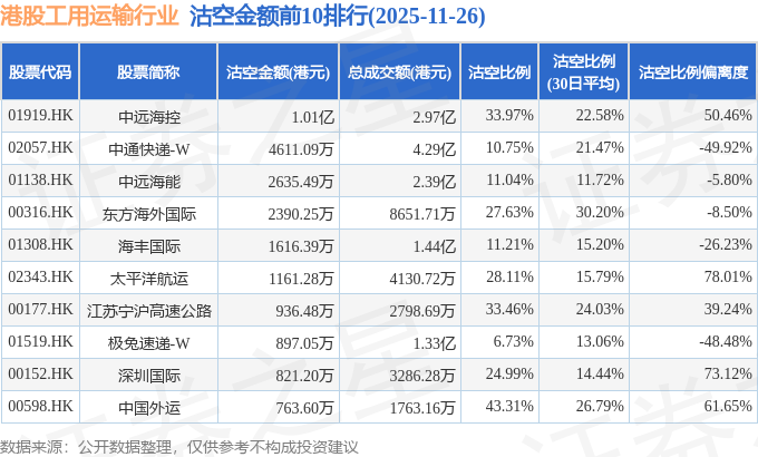 从沽空金额来看,中远海控、中通快递-W、中远海能沽空金额位居行业前三,分别为1.01亿港元、4611.09万港元、2635.49万港元。