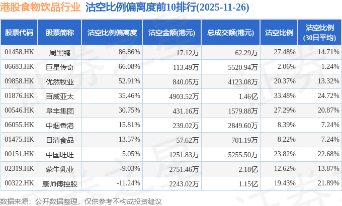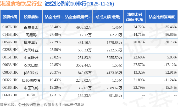 从沽空比例来看,百威亚太、周黑鸭、阜丰集团沽空比例位居行业前三,分别为33.48%、27.48%、27.29%。