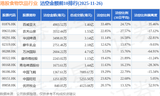 从沽空金额来看,百威亚太、农夫山泉、华润啤酒沽空金额位居行业前三,分别为4903.52万港元、3552.44万港元、3498.81万港元。