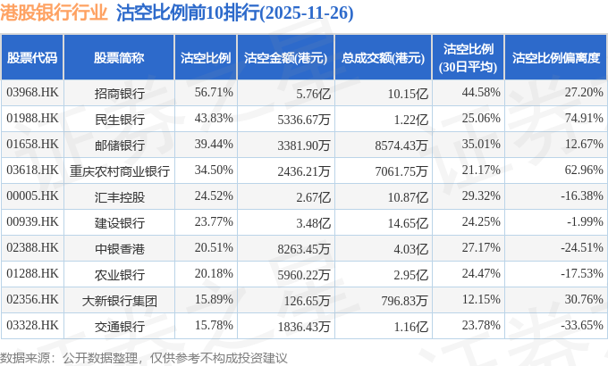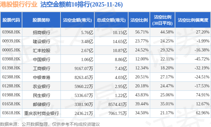 从沽空金额来看,招商银行、建设银行、汇丰控股沽空金额位居行业前三,分别为5.76亿港元、3.48亿港元、2.67亿港元。