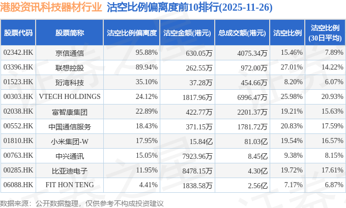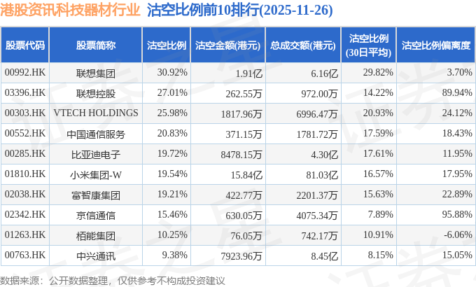 从沽空比例来看,联想集团、联想控股、VTECH HOLDINGS沽空比例位居行业前三,分别为30.92%、27.01%、25.98%。