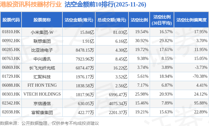 从沽空金额来看,小米集团-W、联想集团、比亚迪电子沽空金额位居行业前三,分别为15.84亿港元、1.91亿港元、8478.15万港元。