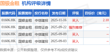 截至2025年11月26日收盘,国银金租(01606.HK)报收于1.69港元,上涨1.81%,成交量289.0万股,成交额484.79万港元。投行对该股的评级以买入为主,近90天内共有3家投行给出买入评级,近90天的目标均价为2.1港元。中信建投最新一份研报给予国银金租买入评级,目标价2.1港元。