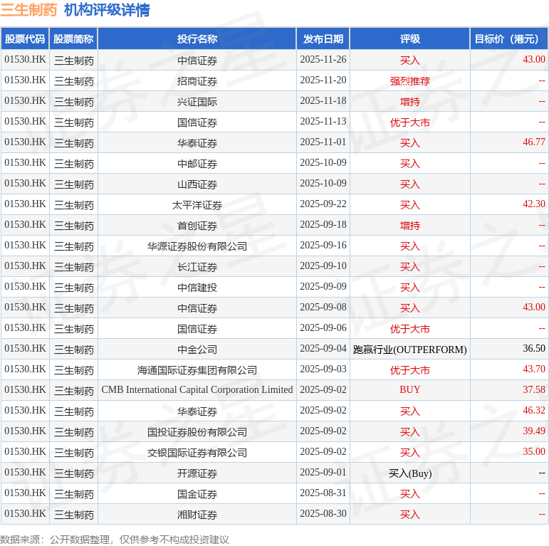 截至2025年11月26日收盘,三生制药(01530.HK)报收于31.58港元,上涨3.75%,成交量2131.63万股,成交额6.81亿港元。投行对该股的评级以买入为主,近90天内共有14家投行给出买入评级,近90天的目标均价为41.37港元。中信证券最新一份研报给予三生制药买入评级,目标价43港元。