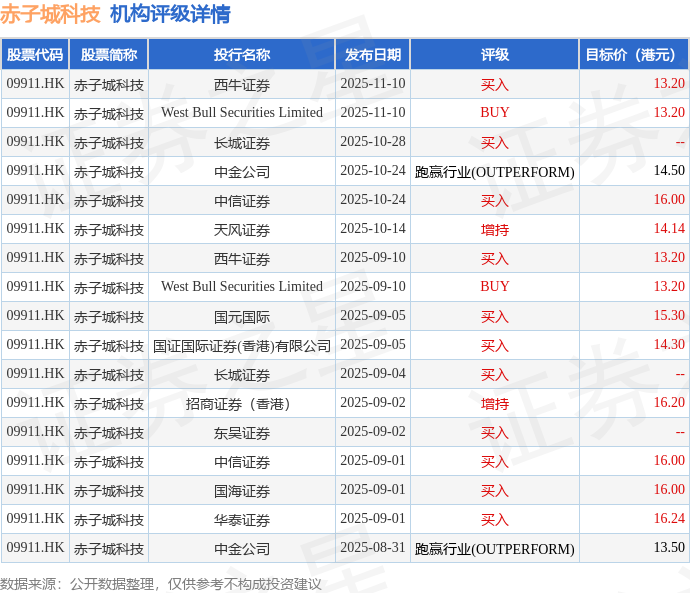 截至2025年11月26日收盘,赤子城科技(09911.HK)报收于9.26港元,下跌3.04%,成交量220.8万股,成交额2051.49万港元。投行对该股的评级以买入为主,近90天内共有11家投行给出买入评级,近90天的目标均价为14.64港元。西牛证券最新一份研报给予赤子城科技买入评级,目标价13.2港元。