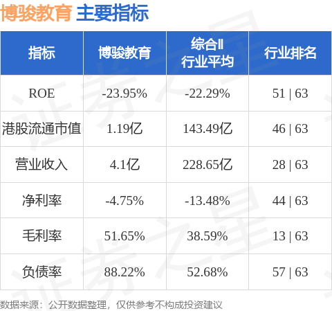 博骏教育港股市值1.19亿港元,在综合Ⅱ行业中排名第46。主要指标见下表: