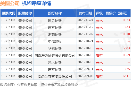 截至2025年11月26日收盘,美图公司(01357.HK)报收于8.59港元,上涨1.3%,成交量3714.79万股,成交额3.15亿港元。投行对该股的评级以买入为主,近90天内共有7家投行给出买入评级,近90天的目标均价为12.28港元。国金证券最新一份研报给予美图公司买入评级,目标价11.73港元。