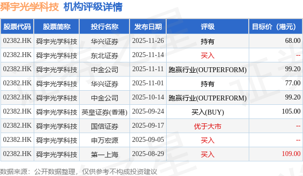 截至2025年11月26日收盘,舜宇光学科技(02382.HK)报收于63.8港元,下跌2.0%,成交量1141.26万股,成交额7.34亿港元。投行对该股的评级以买入为主,近90天内共有3家投行给出买入评级,近90天的目标均价为92.9港元。华兴证券最新一份研报给予舜宇光学科技持有评级,目标价68港元。
