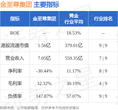 金至尊集团港股市值1.56亿港元,在黄金行业中排名第9。主要指标见下表: