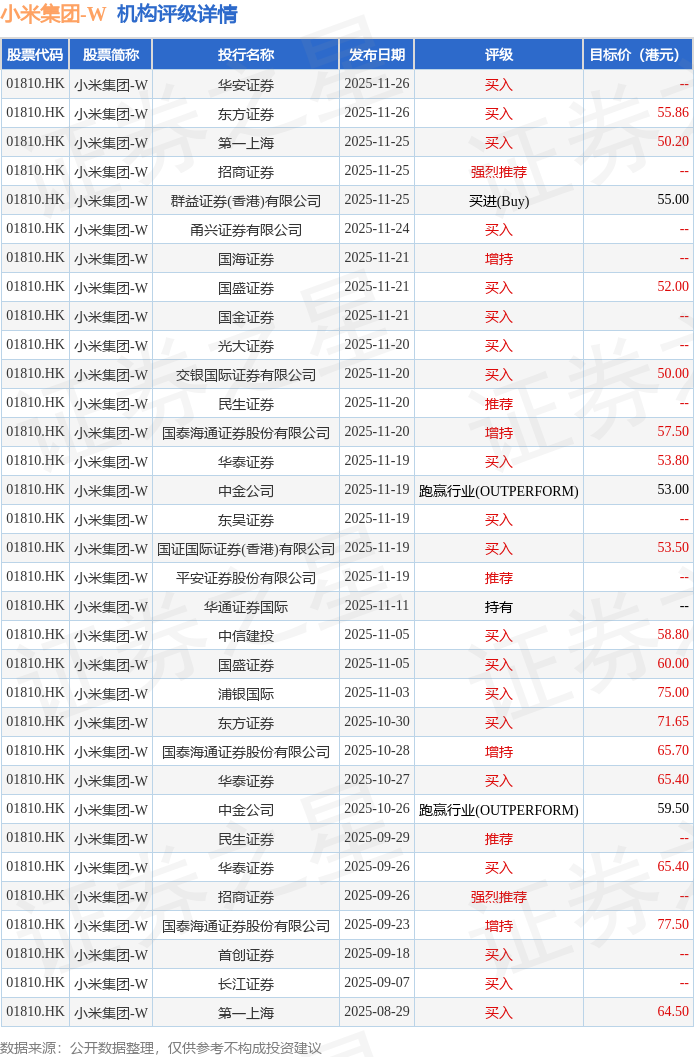投行对该股的评级以买入为主,近90天内共有20家投行给出买入评级,近90天的目标均价为60.23港元。华安证券最新一份研报给予小米集团-W买入评级。