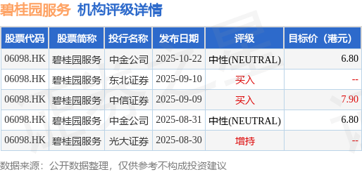 截至2025年11月27日收盘,碧桂园服务(06098.HK)报收于6.49港元,下跌0.15%,成交量1081.61万股,成交额6970.96万港元。投行对该股的评级以买入为主,近90天内共有2家投行给出买入评级,近90天的目标均价为7.17港元。中金公司最新一份研报给予碧桂园服务中性(NEUTRAL)评级,目标价6.8港元。