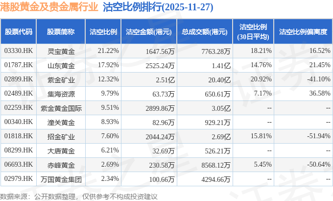 从沽空比例来看,灵宝黄金、山东黄金、紫金矿业沽空比例位居行业前三,分别为21.22%、17.92%、12.32%。