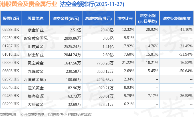 从沽空金额来看,紫金矿业、紫金黄金国际、山东黄金沽空金额位居行业前三,分别为2.51亿港元、2899.86万港元、2525.24万港元。