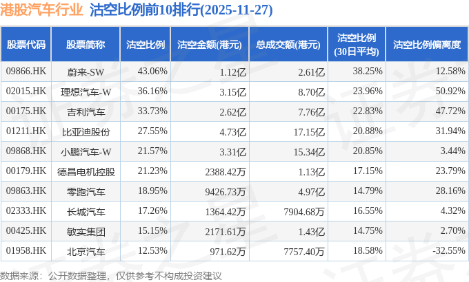 从沽空比例来看,蔚来-SW、理想汽车-W、吉利汽车沽空比例位居行业前三,分别为43.06%、36.16%、33.73%。