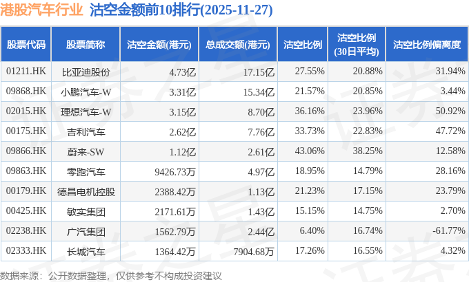 从沽空比例偏离度来看,理想汽车-W、吉利汽车、比亚迪股份沽空比例偏离度位居行业前三,分别为50.92%、47.72%、31.94%。