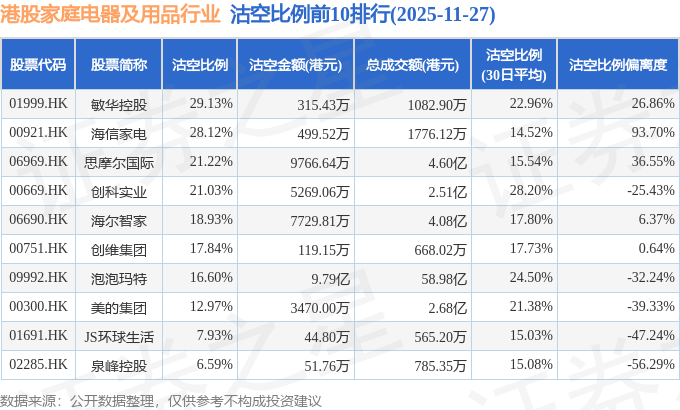 从沽空比例来看,敏华控股、海信家电、思摩尔国际沽空比例位居行业前三,分别为29.13%、28.12%、21.22%。