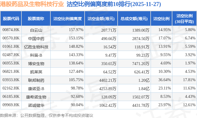 从沽空比例偏离度来看,白云山、中国中药、亿胜生物科技沽空比例偏离度位居行业前三,分别为157.97%、153.15%、148.82%。