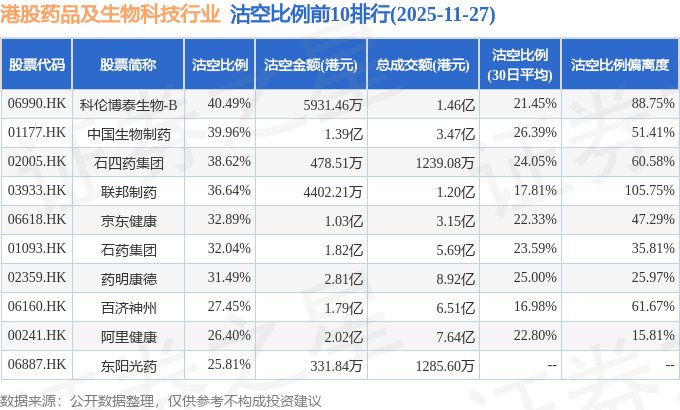 从沽空比例来看,科伦博泰生物-B、中国生物制药、石四药集团沽空比例位居行业前三,分别为40.49%、39.96%、38.62%。